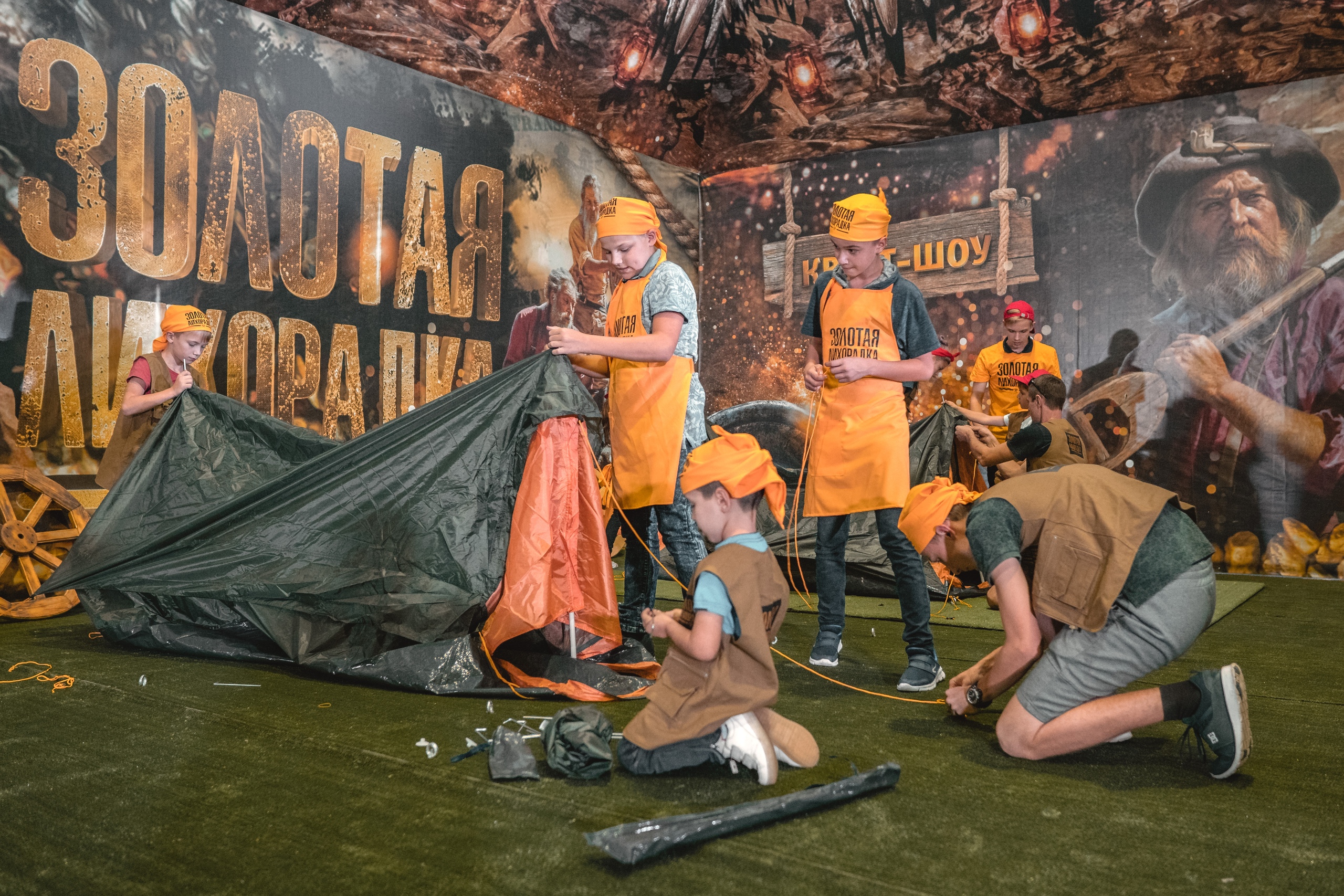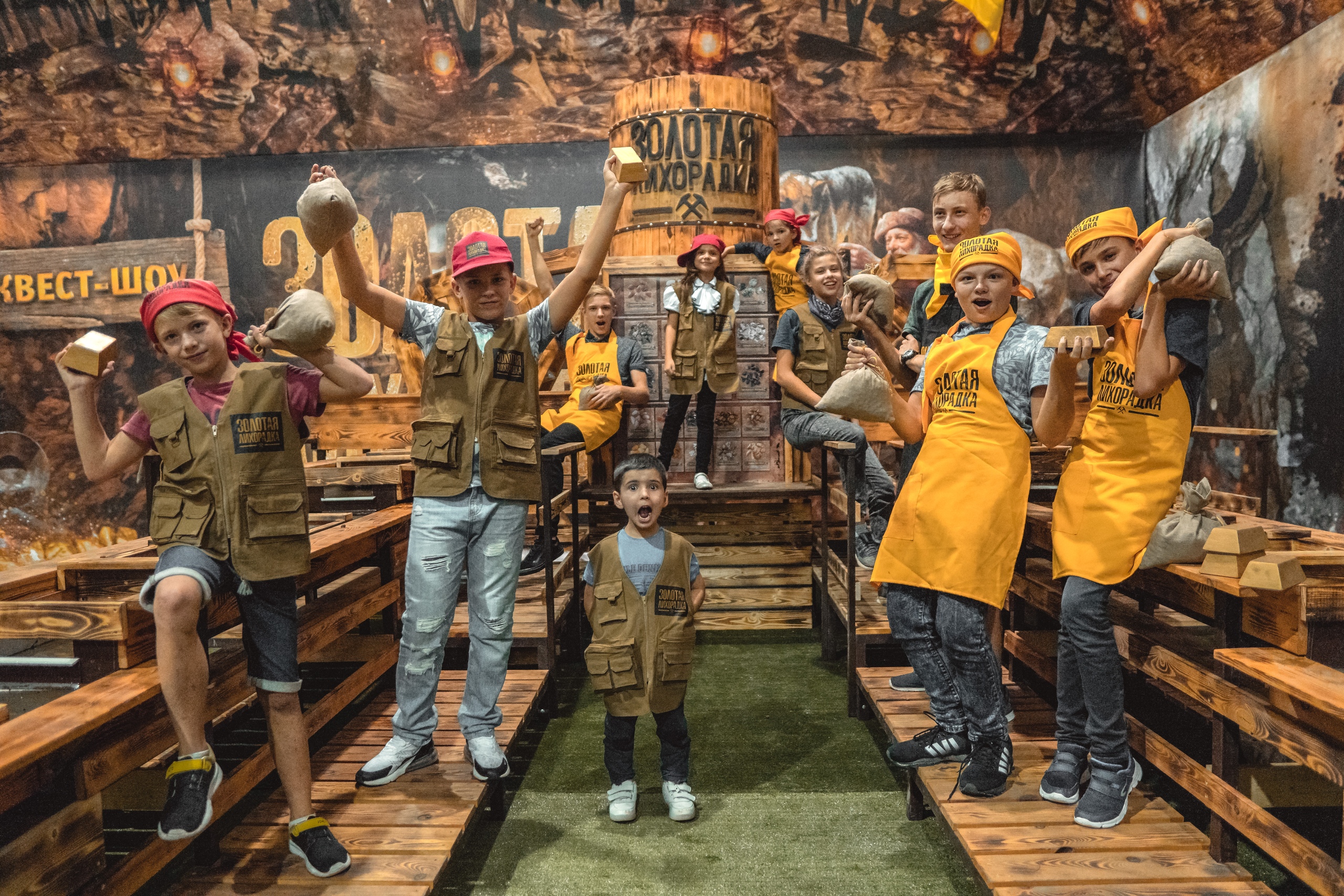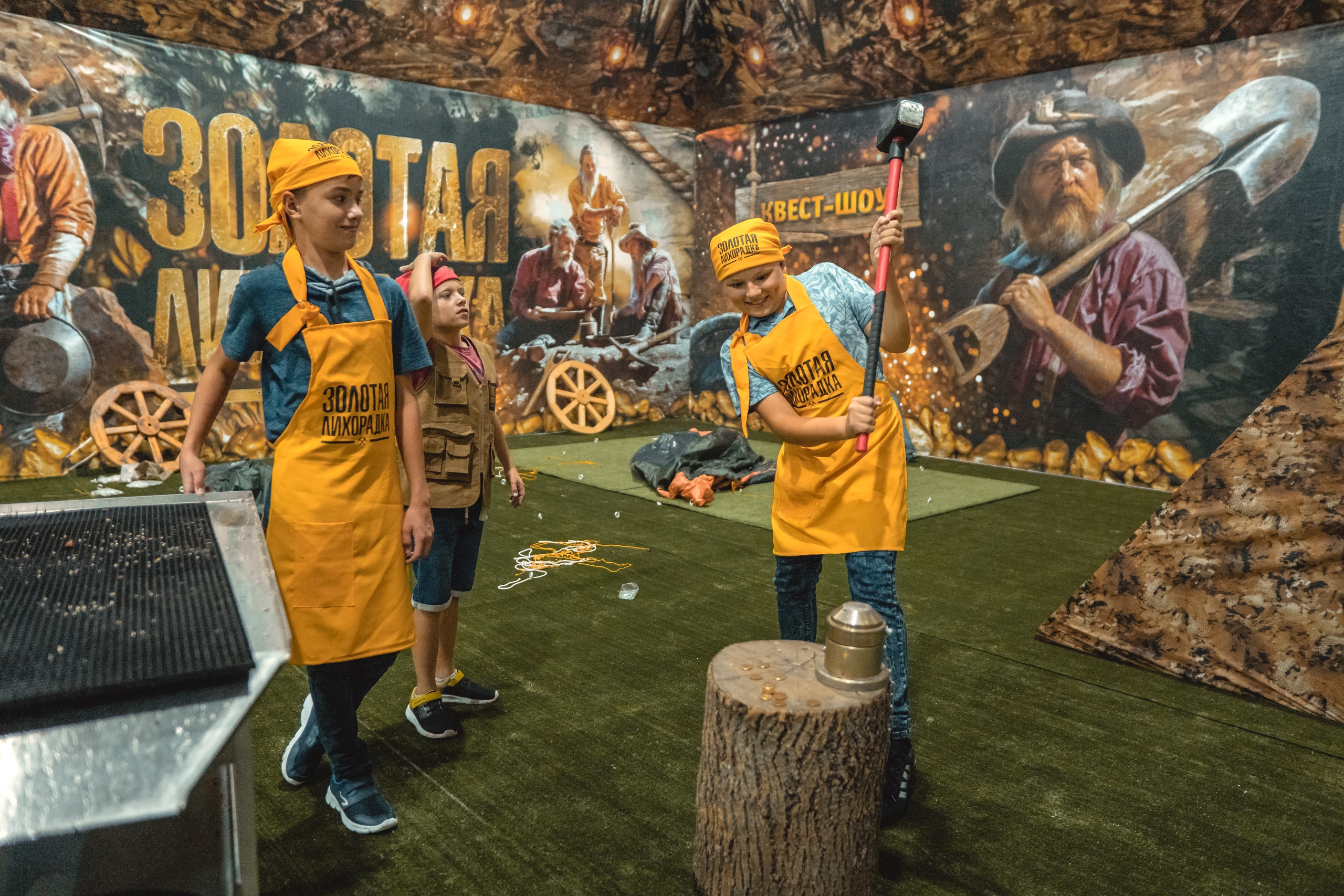 Гости надевают экипировку, произносят клятву золотоискателя и расходятся по 4 локациям, в зависимости от команды и начинают заниматься там своим делом. С каждой группой находится собственный ведущий.